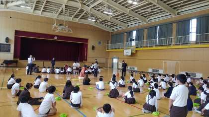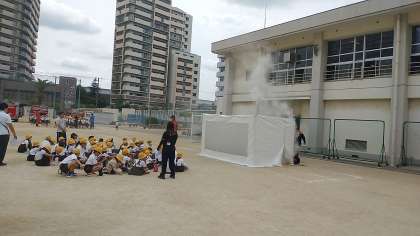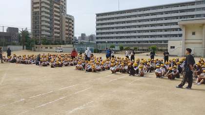 まずはじめに、地震と津波を想定した避難訓練を行いました。子どもたちは、運動場に集合してから、校舎の4階まで避難しました。静かに落ち着いて行動することができていました。
