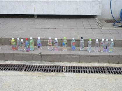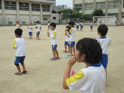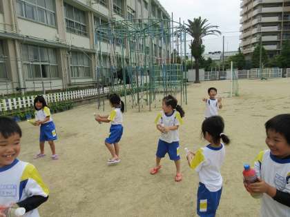 曇り空でしたが、1年生は運動場で、ペットボトルを使った水てっぽう遊びや、しゃぼん玉遊びができました。