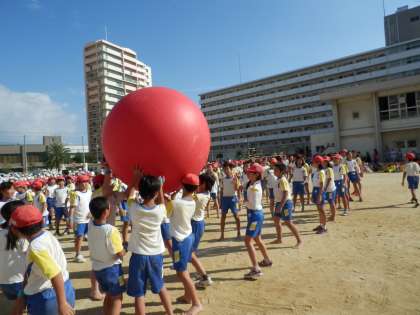 全学年で『大玉送り』に取り組みました。子どもたちは力を合わせて大玉を運んでいました。