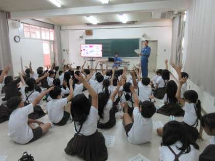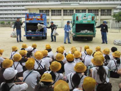 6月27日(木)、4年生の社会科の学習の一環として、大阪市の南西環境事業局の方々に来ていただきました。実物のパッカー車を運動場に乗り入れ、ごみの回収の仕方や車の仕組みについて説明していただきました。運転席に乗車体験もさせてもらい、子どもたちはとても満足そうでした。また、多目的室では、ごみの分別の仕方などについて学習しました。