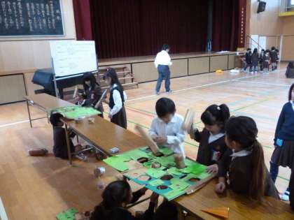 自分たちで考え作ったお店に、クラスメイトなどがお客さんとしてやってきます。店番をつとめる子どもたちは、言葉使いにも気をつけながら、真剣に案内したり、ルール説明をしたりしました。