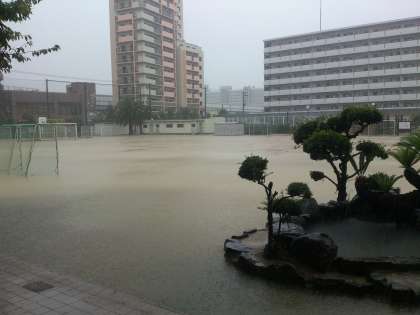 台風の影響で悪天候が予想されたため、予定していた1年生の遠足が延期になりました。子どもたちが登校した後に大雨が降り、運動場は一面水びたしになりました。お昼の時間は、体育館にシートを敷いて1年生みんなでお弁当を食べました。