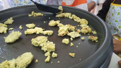 エプロンなどを身に着けた子どもたちは、レンジで温めたサツマイモに砂糖や豆乳を混ぜ合わせます。さらにホットプレートで焼いて、ほんのり焦げ目がついたら、スイートポテトの出来上がり!