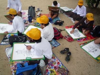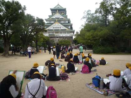 5年生は大阪城公園に写生会に出かけました。天守閣前の広場から見る大阪城を一生懸命にペンで描いていました。大阪城の見学に来られていた観光客の方から、「上手ね」、「Good job!」とたくさん声をかけられていました。