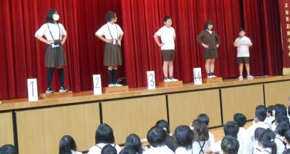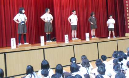 今朝の児童集会の様子です。この日は集会委員会による「人間まちがい探し」が行われました。舞台にいる集会委員会のポーズや服装をよく見て記憶し、変わったところを探し出すゲームです。上下の写真でどこが変わっているか、見つけられますか?