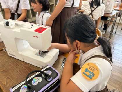 上糸をかけることにとても苦戦していましたが、クラスのミシンマスターを中心に、子どもたち同士で教え合うことで、楽しく学習できました。