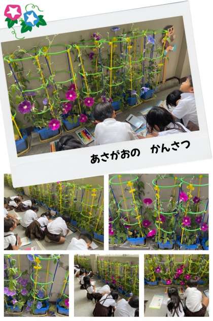 生活科の授業で、あさがおの成長を観察して記録しました。観察するときには「色・形・手触り」などを意識してメモをとりました。葉がざらざらしている、裏と表は手触りがちがうなど、気づきがありました。
