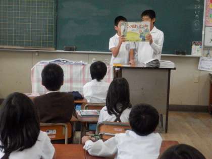 図書委員会は、紙しばいの読み聞かせを企画しました。1年から3年の各教室に図書委員が回り、紙しばいを読んで聞かせていました。