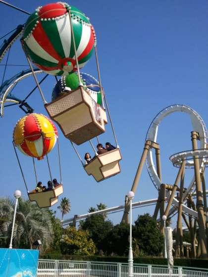 空は気持ちのいい秋晴れ。子どもたちは活動班に分かれて、スペイン村内のアトラクションをグループで楽しんでいます。