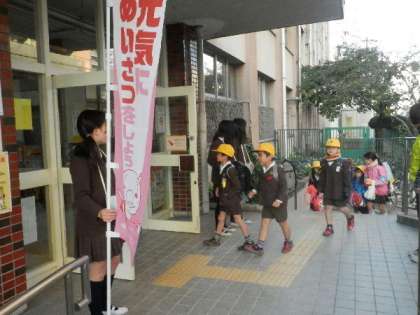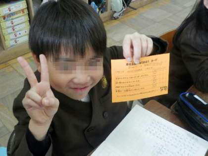 今週は、あいさつを重点とした生活規律をふりかえる、生活指導強調週間です。子どもたちは、終わりの会で1日をふりかえり「あいさつ」「忘れ物」「学校のきまり」「学習への臨みかた」の4つの項目が書かれたチェックカードに毎日記入して、生活改善に努めています。代表委員会の子どもたちは玄関に立ち、登校してくる子どもたちに声をかけて、あいさつの励行を呼びかけています。