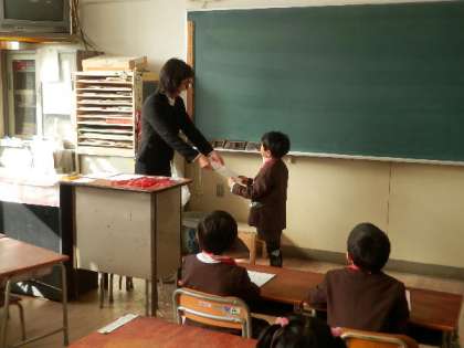 さまざまな行事を通して、子どもたちがさらに大きく成長した2学期も、あっという間に終業式を迎えました。今年度は例年より1日遅い終業式となりました。体育館での終業式の後、子どもたちは教室に戻って、担任から通知票を手渡されました。