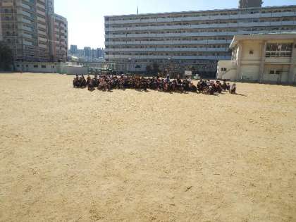 休み時間に地震が発生したことを想定した避難訓練を実施しました。子どもたちが自ら判断して、安全を確保した行動をとることができるようにと今年度初めて実施しました。20分休みに非常ベルがなると、運動場で遊んでいた子どもたちは、自主的に運動場の中央に集まって身をかがめる姿勢を取ることができました。ろうかにいた子どもたちは、窓・壁から離れ、体を低くし頭部を守る姿勢を取っていました。その後、運動場に避難し、集合して安全確認をしました。事前に教室で学んだことを生かすことができたと思います。