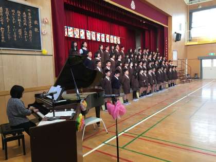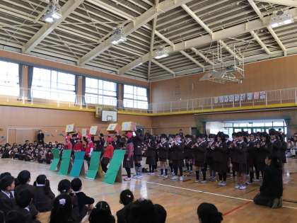 6年生への感謝の気持ちを込めて、全校児童で歌や贈り物でお祝いをしました。