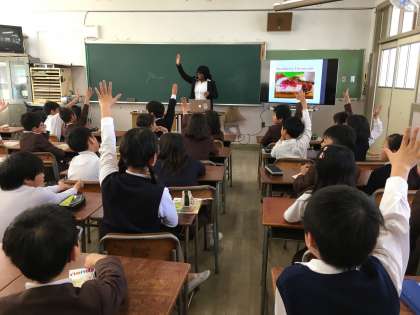 マリー先生を迎え、本日から毎週火曜日高学年で外国語学習が行われます。本日は5年生にとっては初めての英語学習ということで、どうしたらいいのか戸惑いながらも笑顔で英語活動に取り組んでいました。