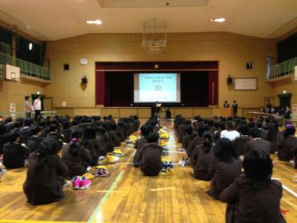 6年生は、加賀屋小学校6年生と共に、加賀屋中学校へ学校見学に出かけました。講堂に集められ、生徒会から学校のきまりや中学校での生活について説明を受けました。その後、各クラブの部長からクラブ活動の紹介がありました。