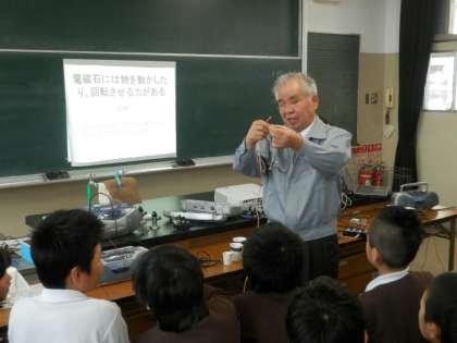 大阪市教育委員会では大阪商工会議所と共同で、企業や企業OB、団体などの外部講師が学校におもむき、高学年に「理科特別授業」事業を行い、科学への関心を高め、いわゆる「理科ばなれ」を防ぐ取り組みを進めています。今回、本校ではその事業を活用して、睦月電機株式会社より講師をお招きして、5年生を対象に「電磁石のはたらき」の授業を実施しました。