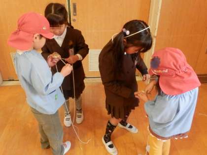 北加賀屋保育所の年長クラスの子どもたちを学校にお招きして、体育館で1年生の子どもたちが交流会を実施しました。お手玉やけん玉、あやとり、コマ回しなど、生活科で学習した昔遊びを、1年生は保育所の子どもたちに優しく教えてあげながら、一緒に楽しみました。