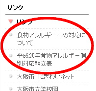 大阪市では食物アレルギー個別対応給食を実施しています。詳しくは、右欄のリンクから大阪市HPをご覧ください。リンク先、4ブロック(住之江区)を選択いただくと、本校の献立表がご覧いただけます。どうぞご活用ください。