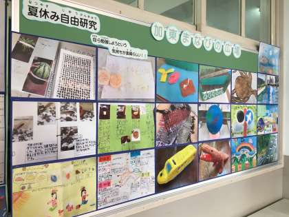 各学級で子ども達がやってきた「夏休みの自由研究」を職員室前に貼り出しました。