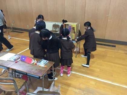 2年生の国語科で「おもちゃ教室を開こう」という学習があります。そこでは、順序良く説明することの大切さ、正しい言葉遣いなどを学習し、そのまとめとしておもちゃ教室を開こうというものです。