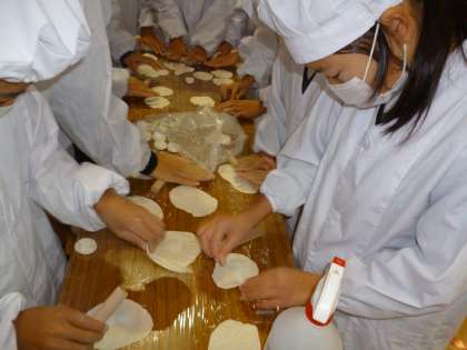 自分たちで餃子の皮をこね、広げ、作り、またチャーシューなどの食材を切り、ラーメンと餃子をみんなで食べるというもので、みんなは楽しみながら、また最後は「美味しい」と喜びの顔でした。