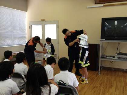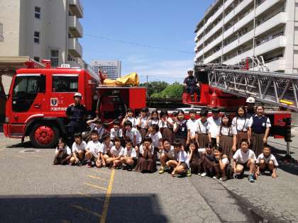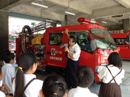 4年生は、住之江消防署に社会見学に出かけました。会議室で大阪市の消防についてのビデオを見た後、署内の見学をしました。はしご車やポンプ車などを見せてもらったり、消防服を着せてもらったりしながら、消防署に働く人たちの仕事について興味深く学ばせてもらいました。見学をし終わってから、子どもたちは署員の方々に「消防服の重さはどれぐらいですか」「どうして消防士になったのですか」などたくさんの質問をしていました。