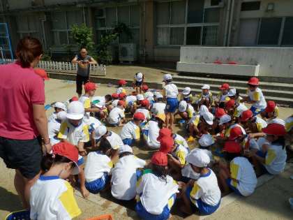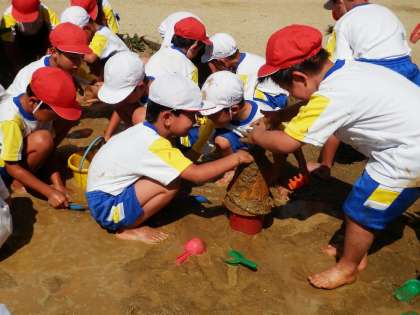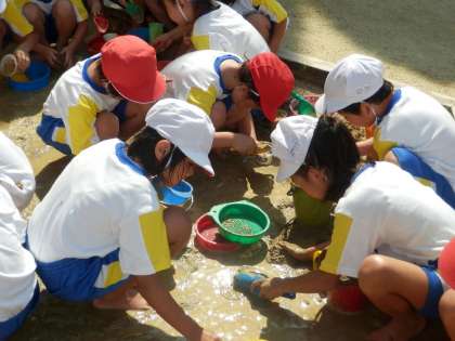 1年生は、生活科「わくわくなつさがし」の学習で泥遊びをしました。泥遊びは子どもたちのさまざまな感覚を刺激し、夏を体感する活動です。子どもたちは、運動場の砂場に入り、思い思いの遊びをして楽しんでいました。生活科の後はプールで水遊びでした。シャワーで体をしっかり洗って汚れを落とし、続くプールでの学習を楽しみました。