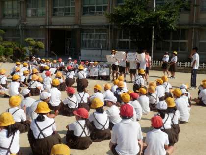 はじめに、代表委員会から、5/31に行われた「子どもまつり」のアンケート集計の結果が発表されました。「来年も行きたいで賞」「おもしろかったで賞」などの各賞の発表のあと、総合発表がされました。1位は5−2「からくりめいろからだっしゅつせよ」、2位は5−1「百円ショップ青春」、3位は6−2「射的&ハテナボックス」でした。