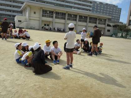 今日は天気も気候も良く、運動場での読み聞かせ会と