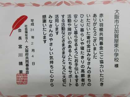 集まったお金を赤い羽根募金のほうへ送っておりましたところ、