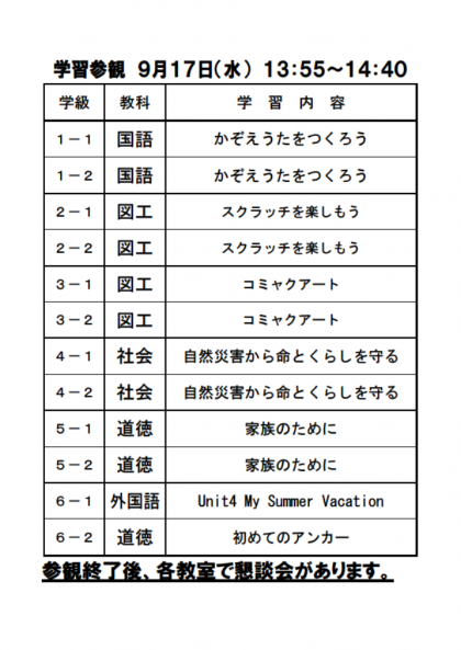 2学期最初の学習参観が9/17にあります。今回は学校公開も兼ねております。参観終了後は学級懇談会もありますので、ぜひそちらもご参加ください。よろしくお願いします。