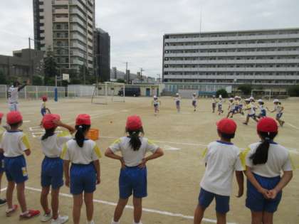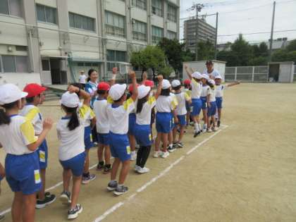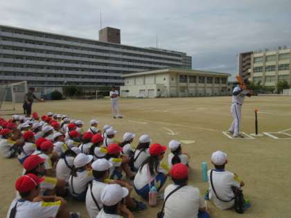 本日2・3時間目にオリックス・バファローズの少年野球教室のコーチ(球団OB)3名を招いて、3年生と4年生対象のティーボール教室を実施していただきました。ルール説明をしたあと各学級に分かれて紅白戦をしました。最後は記念撮影をして、球団オリジナルのグッズもいただきました。