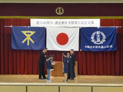 5月11日の土曜日、新北島小学校の創立40周年・講堂兼体育館竣工記念式典を行いました。5月にしては暑いと感じる日でしたが、たくさんの来賓の方々や保護者の方々に参加していただき、子どもたちと一緒にお祝いすることができました。