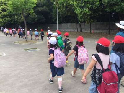 1年生は小学校に入学してから初めての遠足だったので、とてもわくわくしている様子でした。公園内では、色んなお花を観察し、公園の遊具で遊びました。