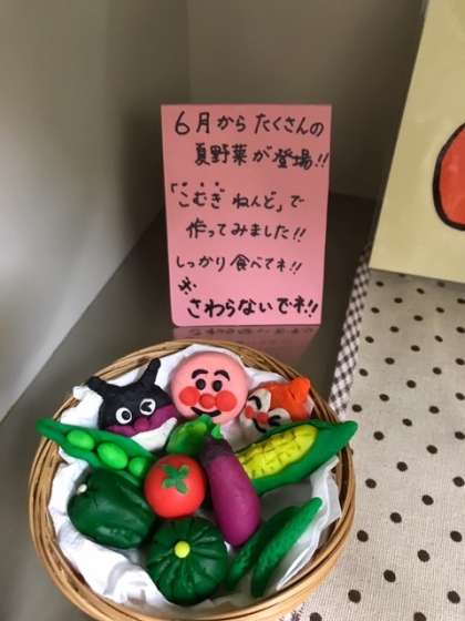 6月になって、給食には夏野菜がたくさん使われるようになってきました。給食調理員さんも給食室に楽しい掲示物を用意してくださいました。
