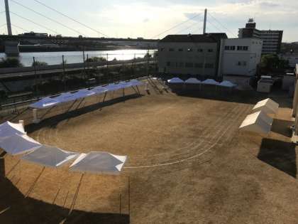 今年度は児童の暑さ対策として、児童席全てにテントを設置します。創立40周年記念事業実行委員会から寄贈していただいたテントと中学校からお借りしたテントを使います。