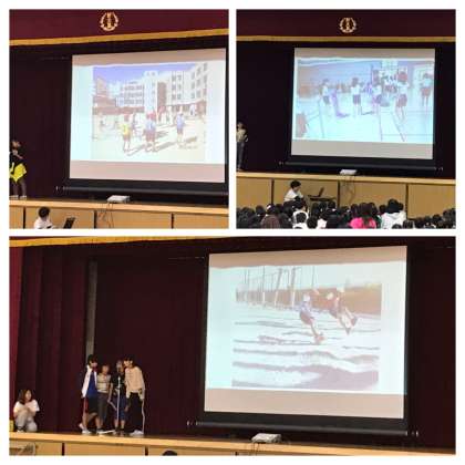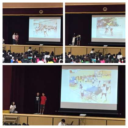現在11種類あるクラブ活動のうち、この日は「バスケットボール」「陸上」「バドミントン」「卓球」「ダンス」「一輪車・縄跳び」の6つのクラブが活動の様子を写真と合わせて紹介してくれました。