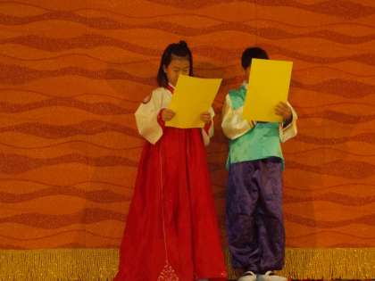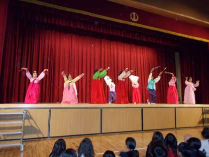 新北島小学校には、韓国朝鮮、中国、ブラジル、インドネシア、チリなどいろいろな国につながりのある児童がいます。その中でも、今回は韓国朝鮮につながりのある児童がチュム(踊り)とサムルノリ(合奏)の発表を行いました。民族学級のみんなはとてもドキドキしながら自分たちの出番を待っていましたが、いざ本番となると日頃の練習の成果を存分に発揮し、とても素晴らしい演技をしていました。