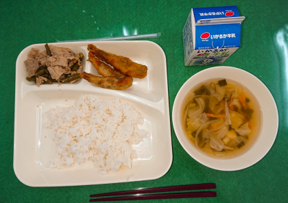 今日の献立は、「ごはん・牛乳・いわしの天ぷら・豚肉とさんど豆の炒めもの・五目汁」でした。