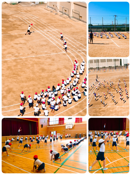 先週までは体育館で団体演技の練習をすることが主でしたが、今週は外に出て立ち位置を確認したり、実際に手具をもって踊ってみたりする姿が見られるようになりました。練習のはじめからすると、曲に合わせた子どもたちの振りや動きも大きくなり、自信をもって演技に取り組んでいることがわかります。
