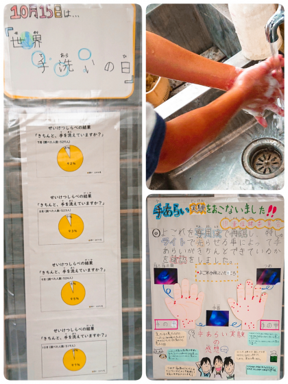 保健室横に掲示してある保健委員会作成の壁新聞には、手洗い実験の結果やせいけつ調べの結果が書かれていました。
