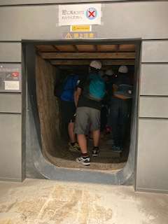 防空壕体験です。狭くて暗い壕の中で、恐怖を感じていました。