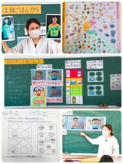 「1日のスタートは朝ごはんから」という題で、朝ごはんを食べると心身にどんな良い効果があるか、どんな献立にしたら栄養バランスが良いかなど、ていねいに指導していただきました。