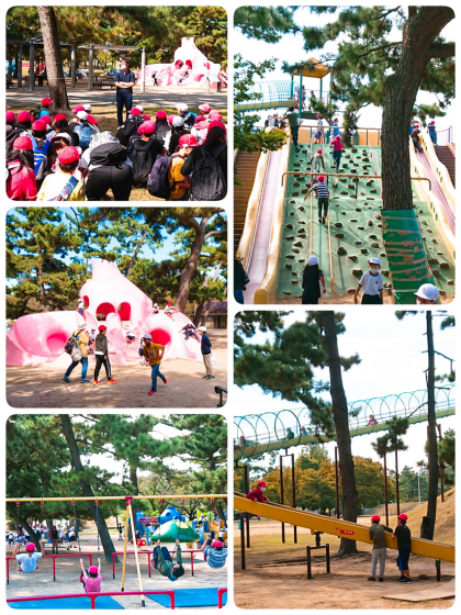 遊具で遊んだり、鬼ごっこをしたり、青空の下、皆、元気です。