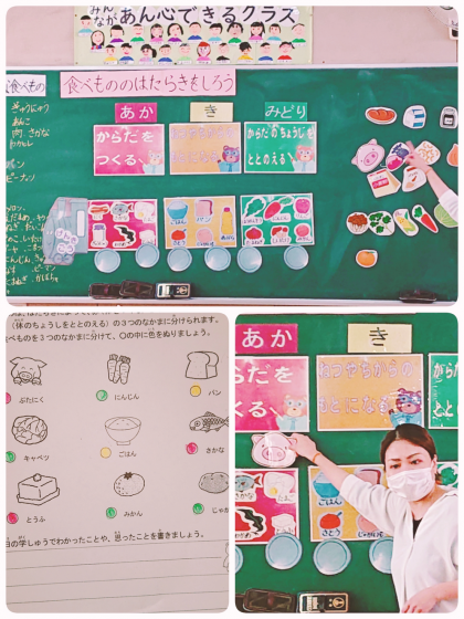 「食べものの はたらきを しろう」という題で、食べものの働きによる仲間分けをし、それぞれの役割について学びました。