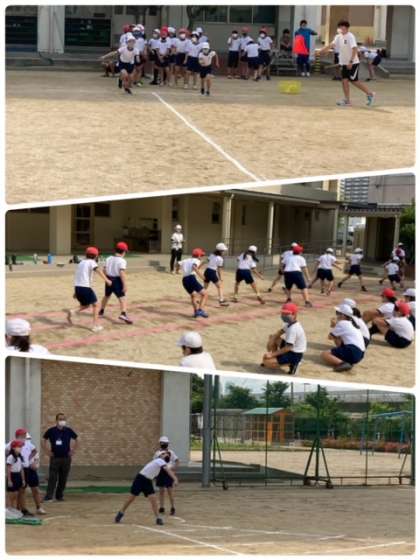 運動場で5年生が、50m走とソフトボール投げ、反復横とびの記録を図りました。