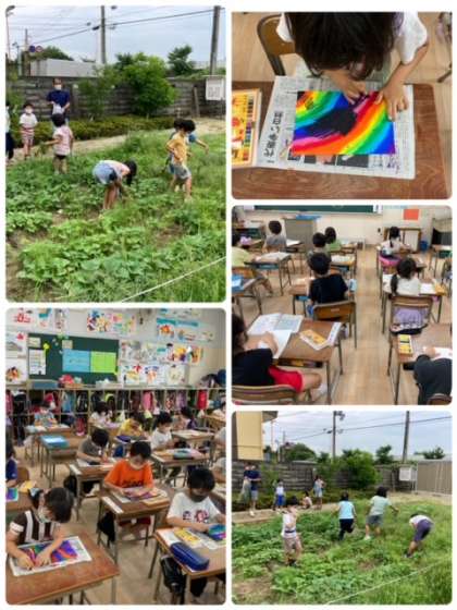 2年生は学習園で雑草抜きをしました。サツマイモを栽培しています。秋の収穫まで、まだまだ世話が必要ですが、大きく育つように頑張ります。