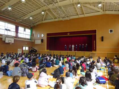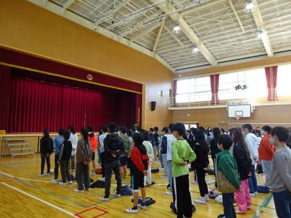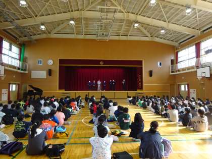 始業式では、校長先生から新しく来られた6名の教職員の紹介があり、みんなで校歌を歌いました。