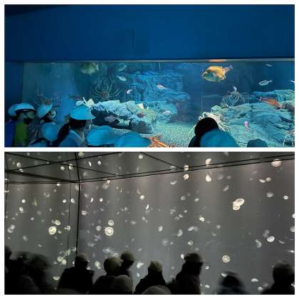 海遊館では、ジンベエザメやシュモクザメがエサを食べる様子が見られたり、コバンザメがウミガメにくっついている様子が見られたりしました。