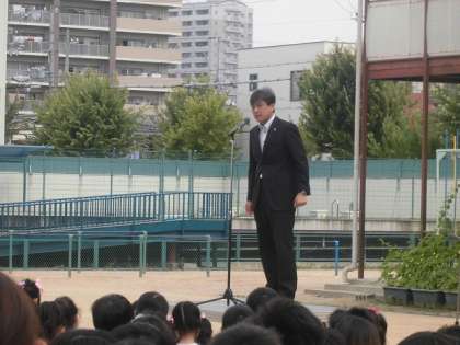 6月22日、児童朝会に高橋英樹住之江区長が来られ、お話をされました。